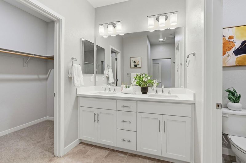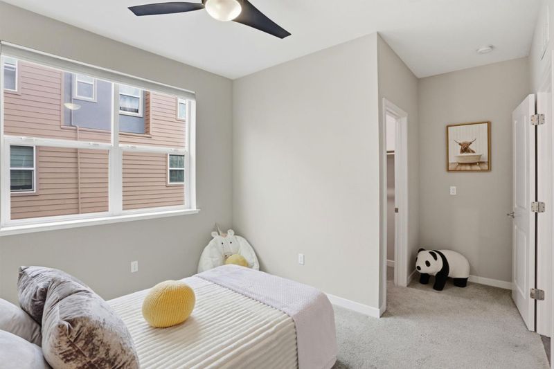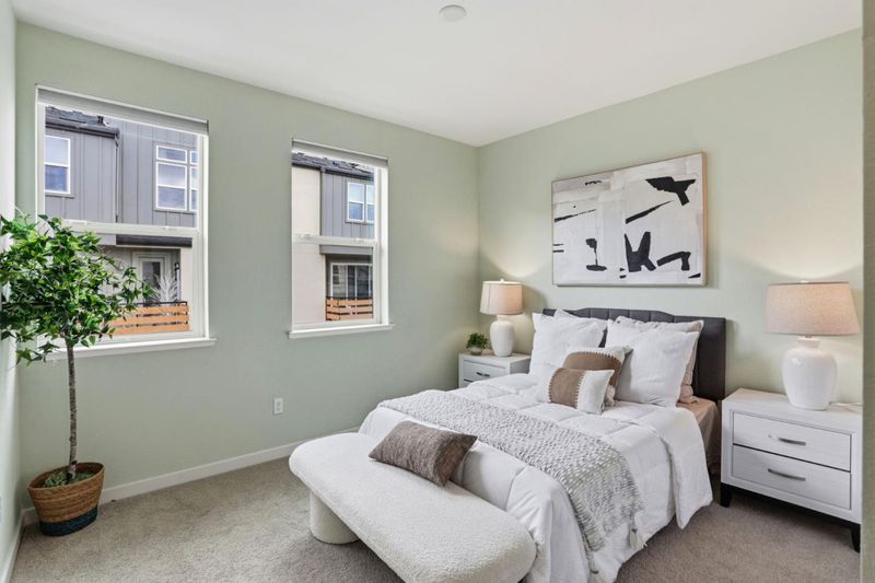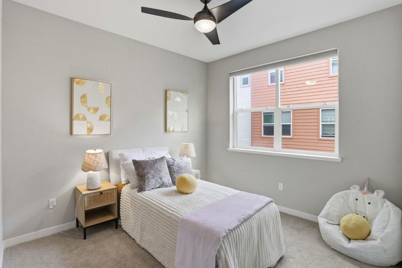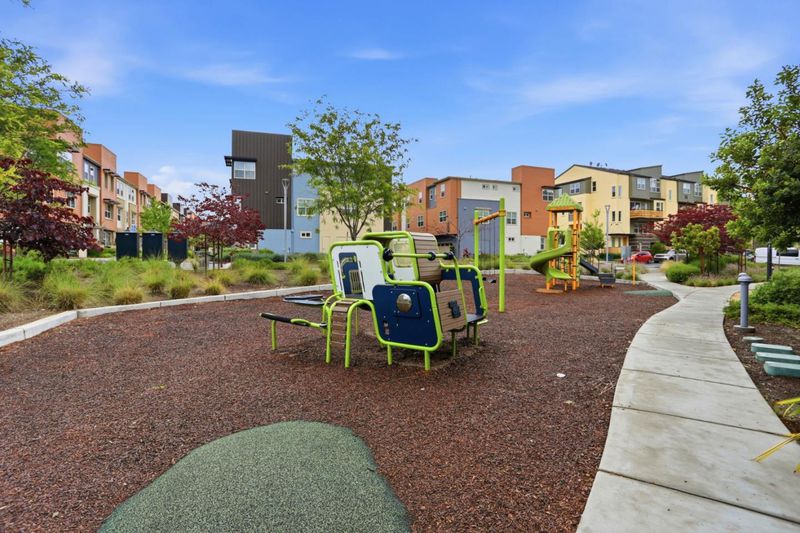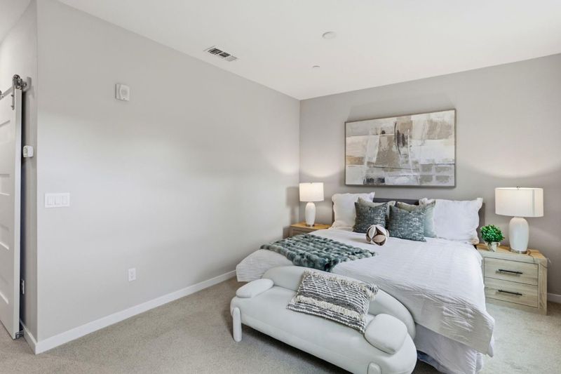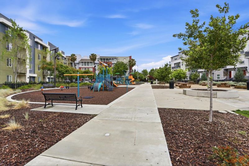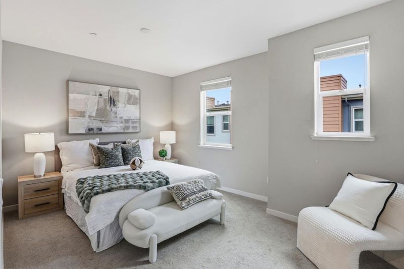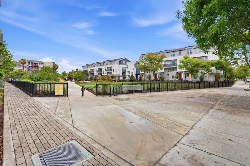Well maintained side-by-side townhome in desirable Onyx community. Well situated in a central location within the complex with children's play areas nearby. Spacious foyer with the front door facing an open green space. Bright and open plan decorated in contemporary colors with engineered hardwood floorings throughout. Formal living and dining areas with soothing natural light. Open and functional kitchen with ample white Shaker wood cabinets, expansive waterfall granite counters, large central island with convenient breakfast bar and completed with upgraded SS appliances. Also featured on the main door is a good size bedroom suitable for grand parents/ long stay guests. Generous master suite with large walk-in closet, ensuite bath with large shower and dual-sink vanity. Each bedroom has its own bathroom. Special amenities in this community include BBQ/picnic area and dog friendly park. Enjoy outdoor activities in the nearby Newbury Park. Convenient location: short commute to downtown San Jose, Japantown, and shopping centers like Costco, Ranch 99, and H-Mart, easy access to BART, VTA, freeways 101/680, and within walking distance to Google and Meta shuttle stops.