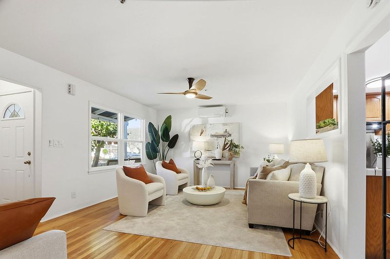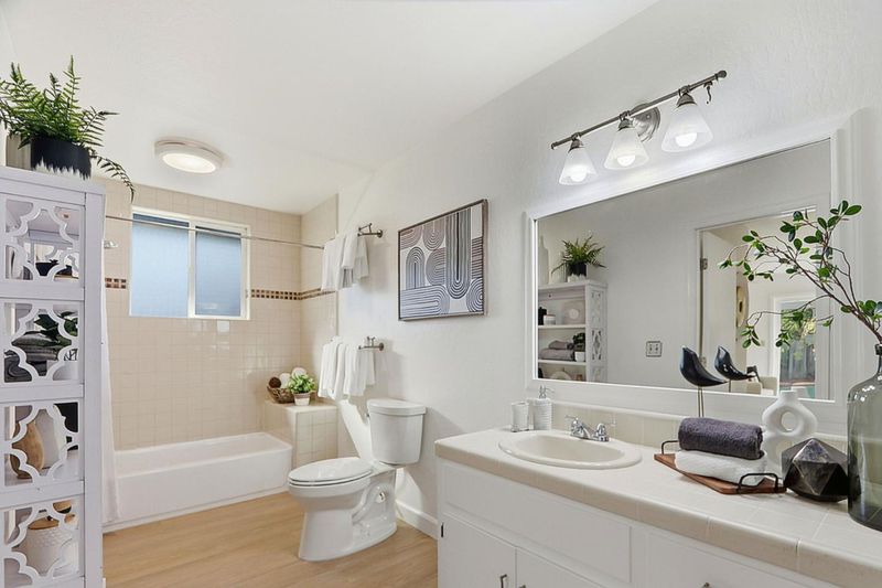 Welcome to this home in the vibrant city of Sunnyvale. With 3BR and 2 full baths, this residence offers a spacious 1,525 sq. ft. living area on a 6,500 sq. ft lot with ample space for entertaining. The property boasts gleaming hardwood floors in the front and newly installed luxury vinyl plank flooring in the kitchen, family room, main bedroom, laundry and both bathrooms, seamlessly blending style and functionality. The home's natural lighting is enhanced by 3 sun tunnels and skylight, while the kitchen features a gas cooktop, tile countertops, refrigerator, dishwasher, garbage disposal, microwave and self-cleaning oven. The cozy family room offers a separate space for relaxation, with sliding door leading to backyard adorned with brick patio, fruit trees and solar heated pool/jacuzzi. Main bedroom includes sliding door access to backyard and walk-in closet with barn door, en suite bath with shower over bathtub. Additional amenities are central heating and A/C, newer roof/gutters, Tesla solar w. battery backup (owned), ceiling fans in each room, electric car charger, drive-thru garage, tankless water heater, fenced backyard, lemon/persimmon trees. Ideal location a short stroll to downtown, public transportation, Washington Park and easy commute to major hi tech employers.