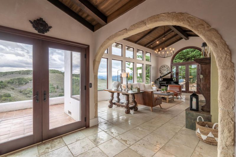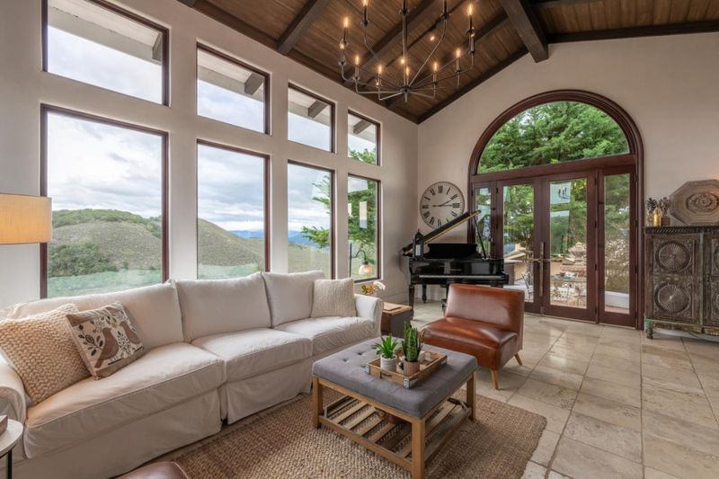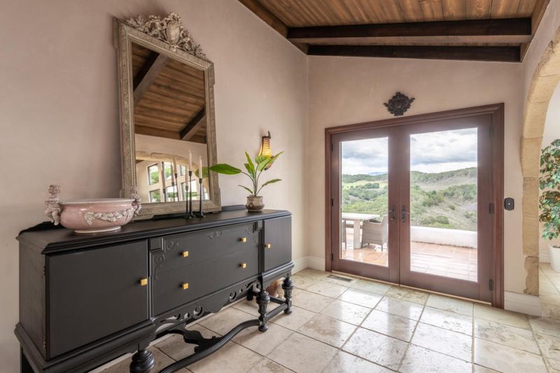 Experience breathtaking views, privacy, and tranquility in this stunning single-level California Mission-style home, featuring 3 bedrooms and 2.5 bathrooms. Nestled on over an acre, it boasts sweeping valley and Santa Lucia Mountain vistas. Enjoy the flexibility of entertaining with over 700 sq. ft. of outdoor patios and an inviting interior courtyard. This exceptional residence showcases a thoughtfully designed layout, highlighted by high wood-beamed ceilings, floor-to-ceiling windows, and elegant stone-wrapped archways. Revel in the beauty of travertine and hardwood floors throughout. The primary suite is a true retreat, featuring a cozy corner fireplace and a luxurious renovated bathroom with a clawfoot tub, timeless tile, and double vanity. The remodeled kitchen, equipped with marble countertops and stainless appliances, offers seamless access to the courtyard for effortless culinary experiences. Additionally, a hobby or bonus room is accessible from the detached two-car garage. Tucked away at the end of a quiet cul-de-sac and private lane, this gem is just minutes from shopping and the beach. Dont miss out on this unique opportunity!