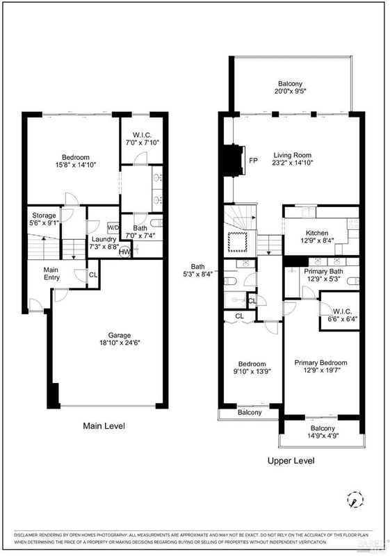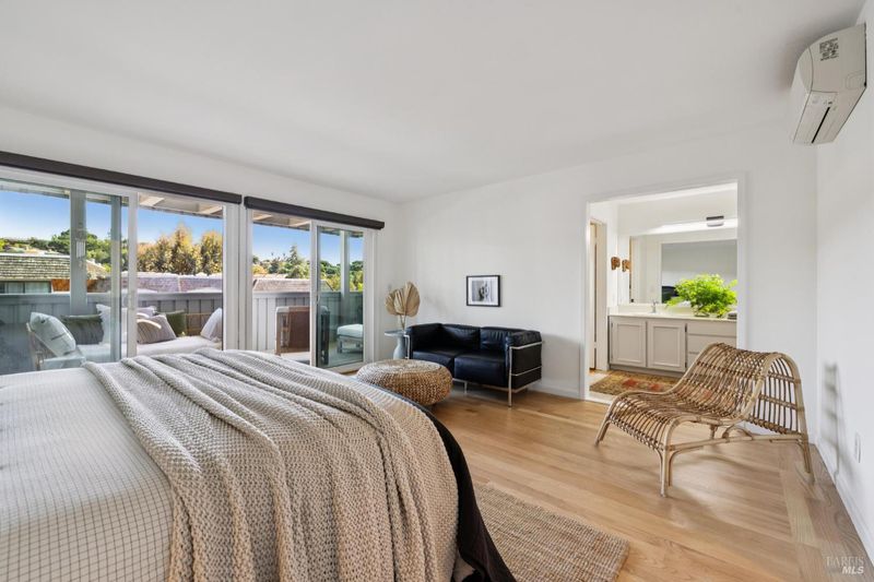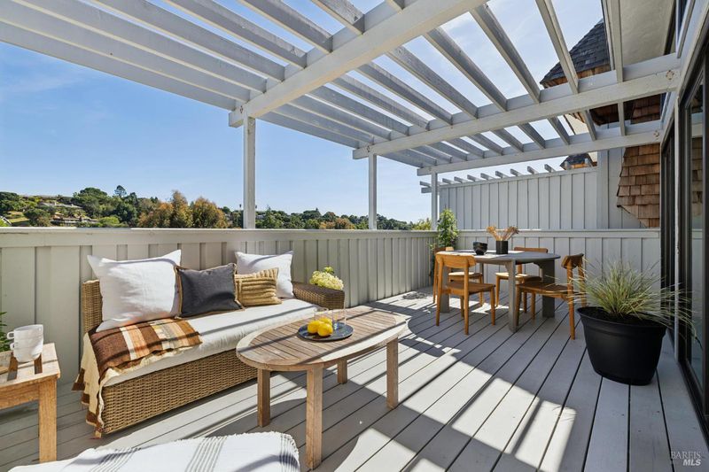 Peacock Gap offers a vacation lifestyle centered around outdoor living and connection to nature, with easy access to Peacock Gap Golf Club, China Camp State Park, McNears Beach Park, and Peacock Park. This 3-bedroom, 2.5-bath townhome offers approximately 1,900 sq ft of living space, including two en-suite bedrooms. The open main level features hardwood floors throughout, generous ceiling height in the living area, and a fireplace. Floor-to-ceiling windows and sliding glass doors throughout bring in natural light and surrounding greenery. The living room opens to a large deck, with a second large deck off the lower-level en-suite providing added privacy. Primary en-suite located on the main level. Kitchen with ample counter space, abundant cabinetry, and skylight. Additional skylight above stairwell. Attached two-car garage with storage. Two walk-in closets.
