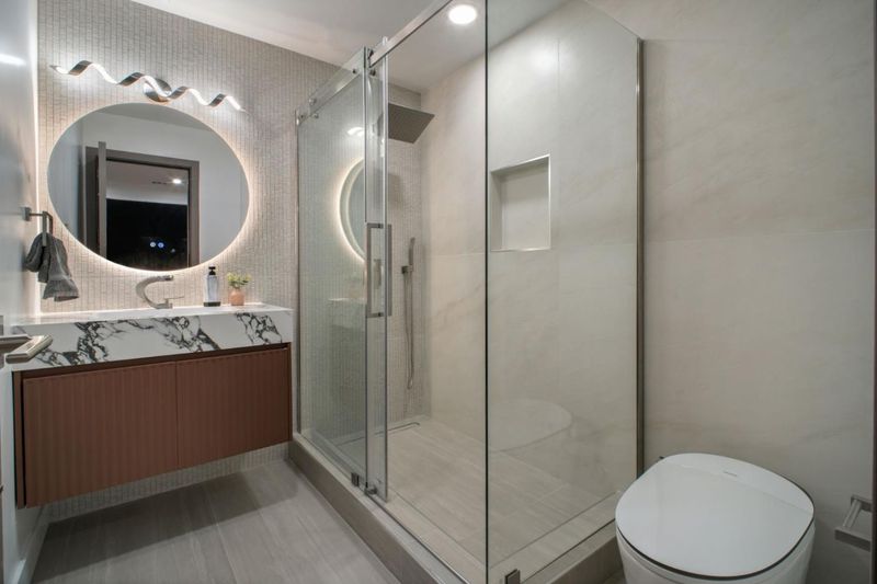 Bidet, Full on Ground Floor, Half on Ground Floor, Marble, Primary - Stall Shower(s), Tile, Updated Bath
