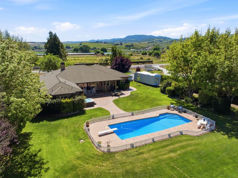Beautiful executive single-story home on over one acre with sweeping views, located in a highly sought-after private equestrian community. This rare opportunity offers the perfect blend of peaceful country living and modern comfort. Rich hardwood floors welcome you into a spacious living area featuring a dramatic wood-beam ceiling and a striking stone-faced fireplace, creating a warm and inviting space for entertaining. The open floor plan flows seamlessly into a chefs kitchen with quartz countertops, stainless steel appliances, a gas stove, built-in microwave, and a walk-in pantry. The spacious primary suite offers a relaxing retreat with dual sinks and two large closet areas. A separate bedroom with a full bath on the opposite side of the home provides ideal privacy for guests. Step outside to a sprawling backyard designed for enjoyment, complete with a sparkling pool and expansive patio space for gatherings. Two storage sheds offer additional storage, and HOA-approved plans for a 1,200 sq. ft. pool house provide exciting possibilities. Residents also enjoy exceptional equestrian amenities including a community barn, arena, round pen, paddocks, and wash racks. Conveniently located near schools, shopping, San Juan Oaks Golf Course, and commuter routes. Welcome home.