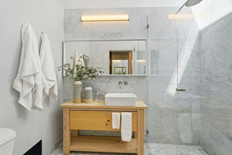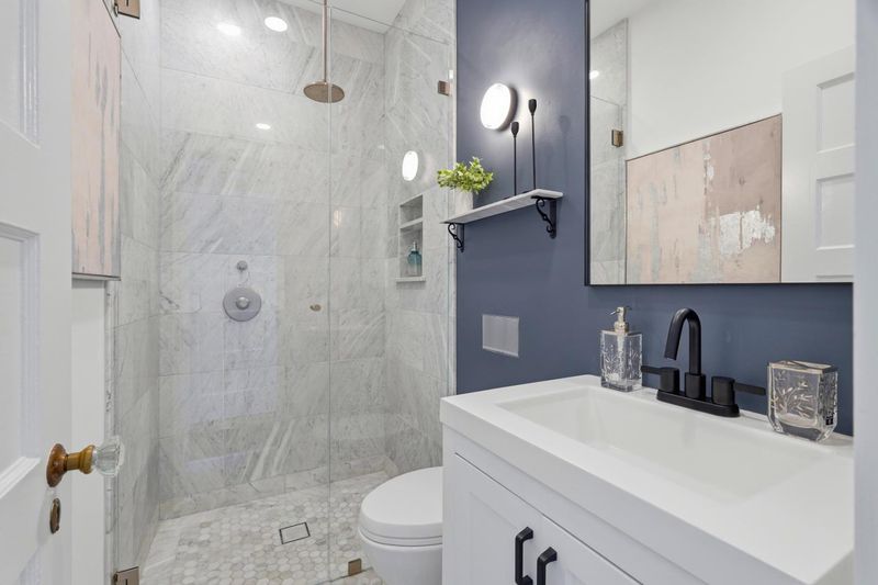 Full on Ground Floor, Marble, Shower over Tub - 1, Skylight, Solid Surface, Stall Shower, Updated Bath