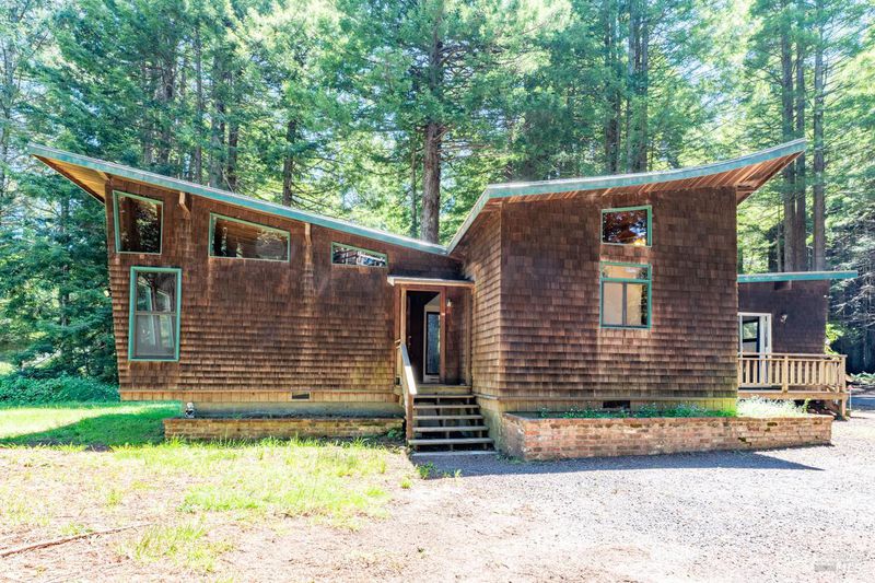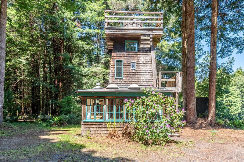The Water Tower Farm - A Storybook Setting on 4 Acres of Country Quiet A blend of redwoods and open meadows, this unique property offers a peaceful retreat with a touch of magic. The four-acre parcel provides generous space for gardens, fruit trees, or a few farm animals. During the rainy season, a vernal pond appears, attracting birds and wildlife and adding to the land's natural charm. The setting feels secluded and serene. At night, the stars shine brightly in the clear country sky, and the air remains cool and fresh, thanks to the nearby ocean. The main home features architecturally unique, swooping lines, along with two bedrooms and one bathroom. Warm wood accents throughout make the space feel both comfortable and inviting. Nearby, the picturesque water tower house offers a delightful surprise. On the main level, there is a sitting area, kitchenette, bathroom, and sleeping alcove. The next level includes a flexible space that could serve as a bedroom, studio, or reading room. Above that, a ladder leads to a lofted bed area tucked beneath the rafters. The land is level and accessible, ready for your vision to take shape. If you are seeking a small homestead, a weekend escape, or a home that feels like it stepped out of a storybook, this property welcomes your imagination.